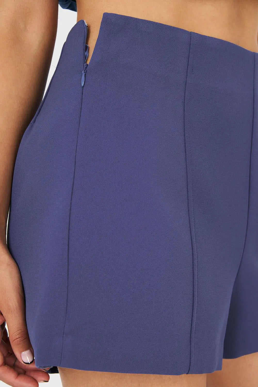 Short Sastrero Azul tiro alto, con pinzas traseras y delanteras, posee un cierre al costado, y no tiene pretina elasticada.